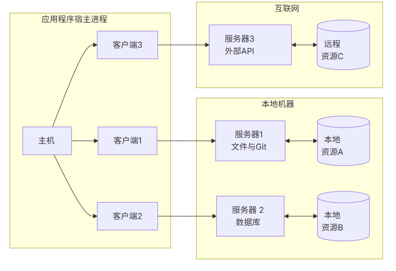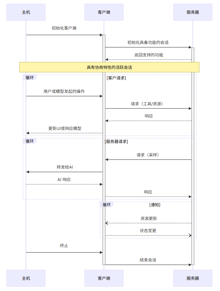 Model Context Protocol (MCP) 采用客户端-主机-服务器架构,每台主机可运行多个客户端实例。该架构使用户能在应用间集成AI能力,同时保持清晰的安全边界并实现关注点隔离。基于JSON-RPC构建的MCP提供了一种有状态的会话协议,专注于客户端与服务器之间的上下文交换和采样协调。