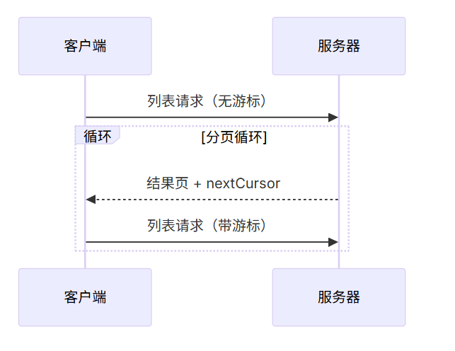 nextCursor作为结果结束 - 当没有nextCursor时停止分页 - 支持分页和非分页两种流程 - 兼容不支持分页的服务器